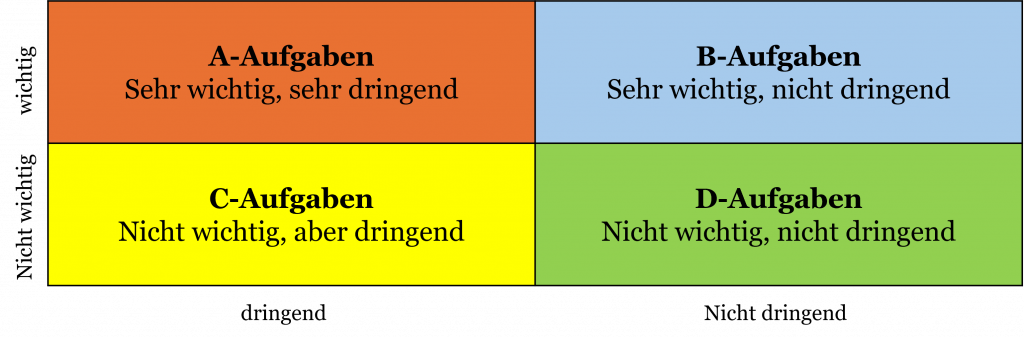 In diesem System werden die Aufgaben in vier Quadranten nach Wichtigkeit und Dringlichkeit aufgeteilt.