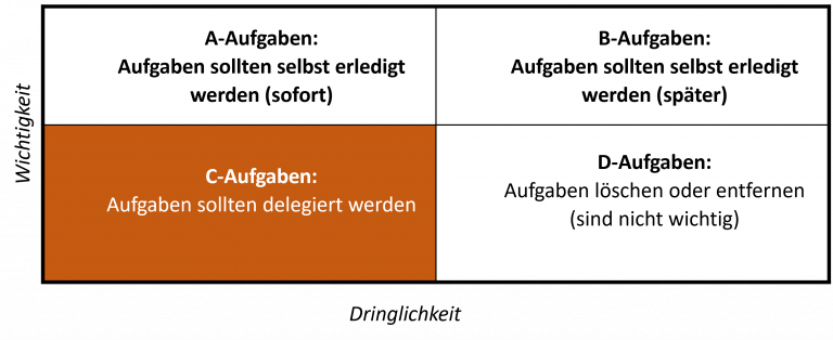 In diesem Fall sind die C-Aufgaben entscheidend: Diese sind nicht so wichtig, dass Sie sie selbst erledigen müssen. Sie können sie an ihre Kolleg*innen abgeben oder an Mitarbeiter*innen delegieren. Seien Sie präzise in dem, was Sie sich als Ergebnis wünschen und sprechen Sie klare Termine für die Fertigstellung ab. Das beruhigt Sie und schafft für den/die Gegenüber einen klaren Rahmen. Gelingt die Delegation, werden Sie künftig vermutlich immer mehr Aufgaben bei den C-Aufgaben einordnen können und so Ihre Arbeitszeit reduzieren.