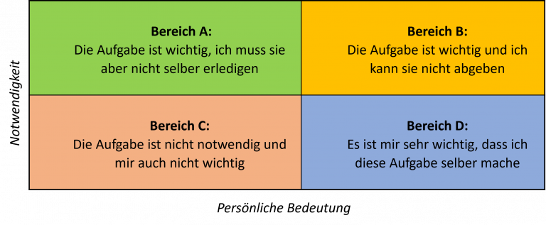 Manchmal stellt sich aber beim Erstellen der Übersichtskarte heraus, dass Sie zu viele Tätigkeitsbereiche haben, um Sie in Ihrem Tag, der auch nur 24 Stunden hat, unterzubringen. Wenn dies der Fall ist, können Sie Aufgaben Delegieren oder Reduzieren. Hierzu können Sie die Bereiche aus Ihrer Übersichtskarte in eine Matrix einteilen, ähnlich wie beim Eisenhower Prinzip: Bewährt hat sich eine Bewertung nach folgenden Kategorien:
